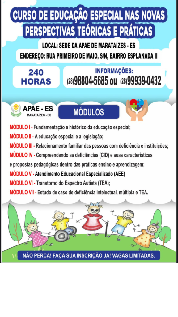 A Apae de Marataízes abre inscrições para Curso de Educação Especial na Novas Perspectivas Teóricas e Práticas, para professores, pedagogos, psicólogos e cuidadores de PcD (Pessoas com Deficiência).
