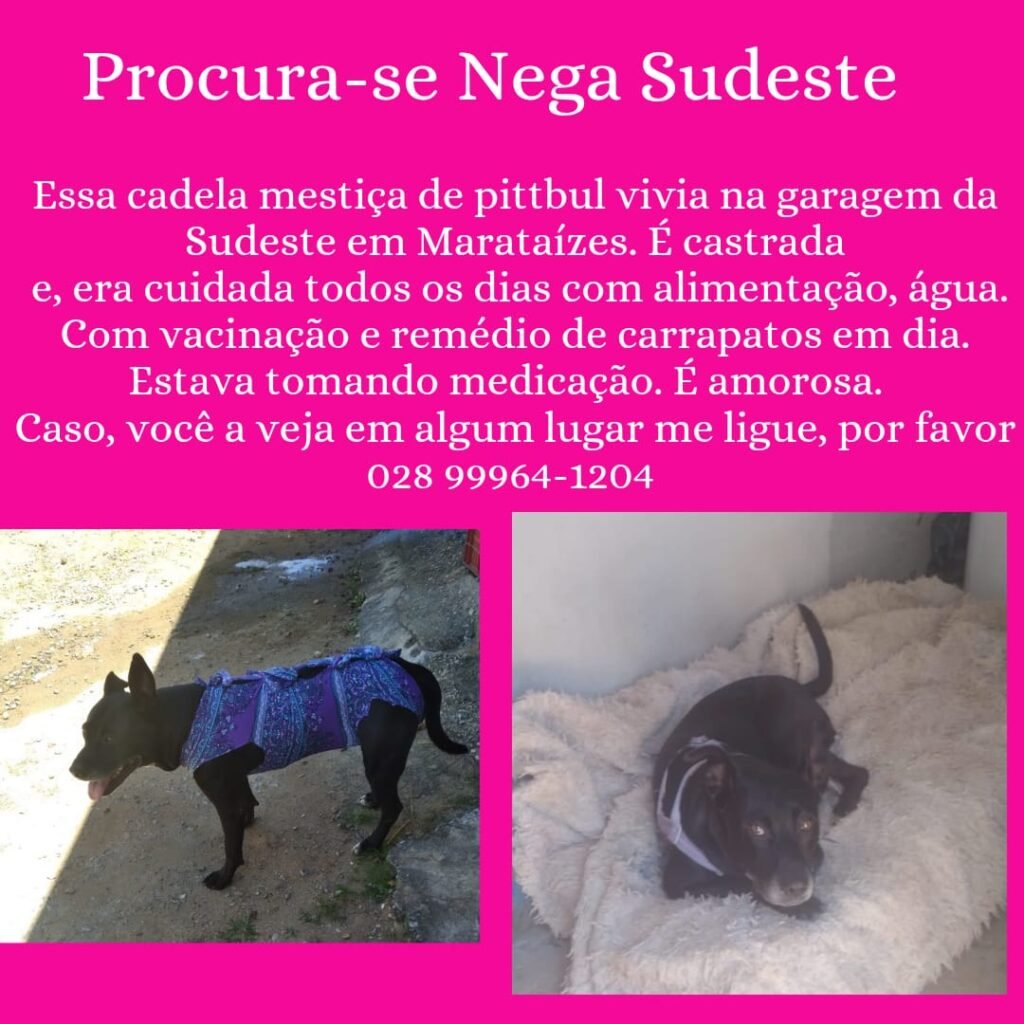 Caso você tenha visto uma cadelinha parecida com a Nega da Sudeste, entre em contato com o 28 99964-1204 (Lenilceia). Ajude-a a voltar para a sua casa, pois todos sentem sua falta e estão muito preocupados com o seu bem estar. A Nega da Sudeste tem uma enorme família procurando por ela.