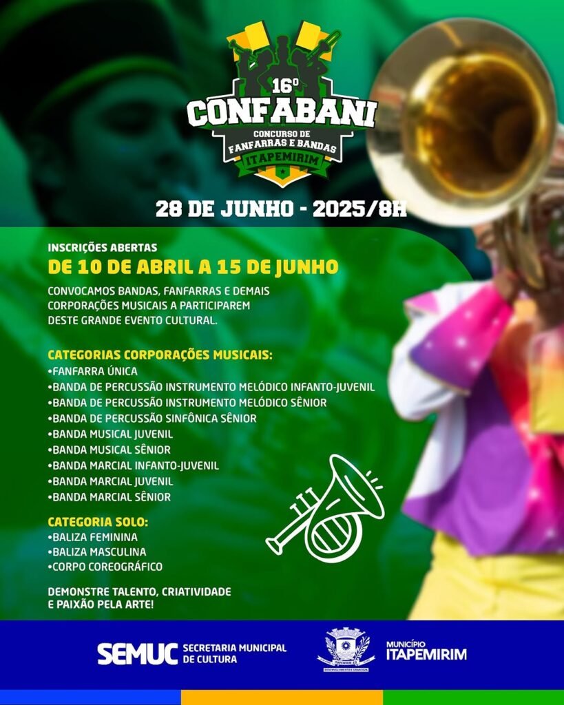A Prefeitura de Itapemirim através da Secretaria Municipal de Cultural abre inscrições para o tradicional Concurso de Fanfarras e Bandas – CONFABANI – que este ano chega à sua 16ª edição. Com categorias para diversas formações musicais e apresentações solo, o evento está marcado para no dia 28 de junho de 2025, a partir das 8h na Praça Domingos José Martins. Na programação o evento promete um show de talento, ritmo e energia.