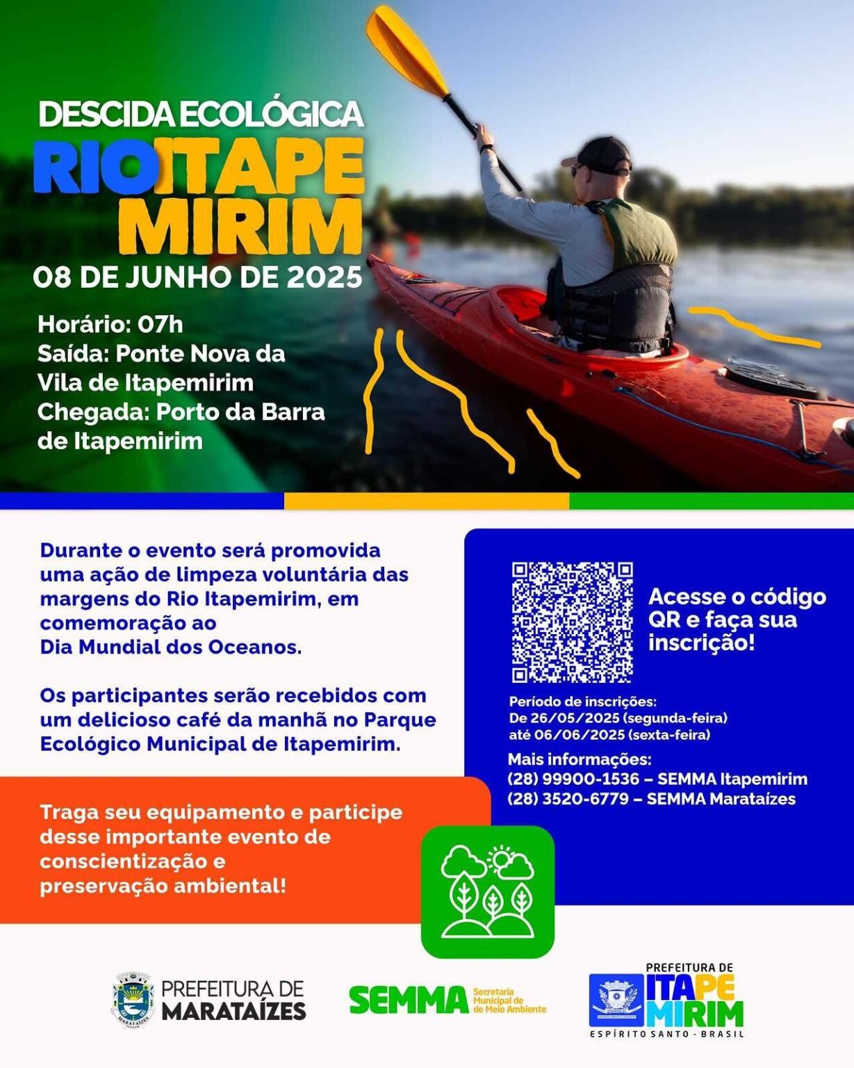No próximo dia 08 de junho de 2025, os municípios de Itapemirim e Marataízes se unem em uma grande mobilização ambiental: a Descida Ecológica do Rio Itapemirim. O evento, que terá início às 7h da manhã, promete reunir voluntários e amantes da natureza em uma ação conjunta de preservação e conscientização ambiental.