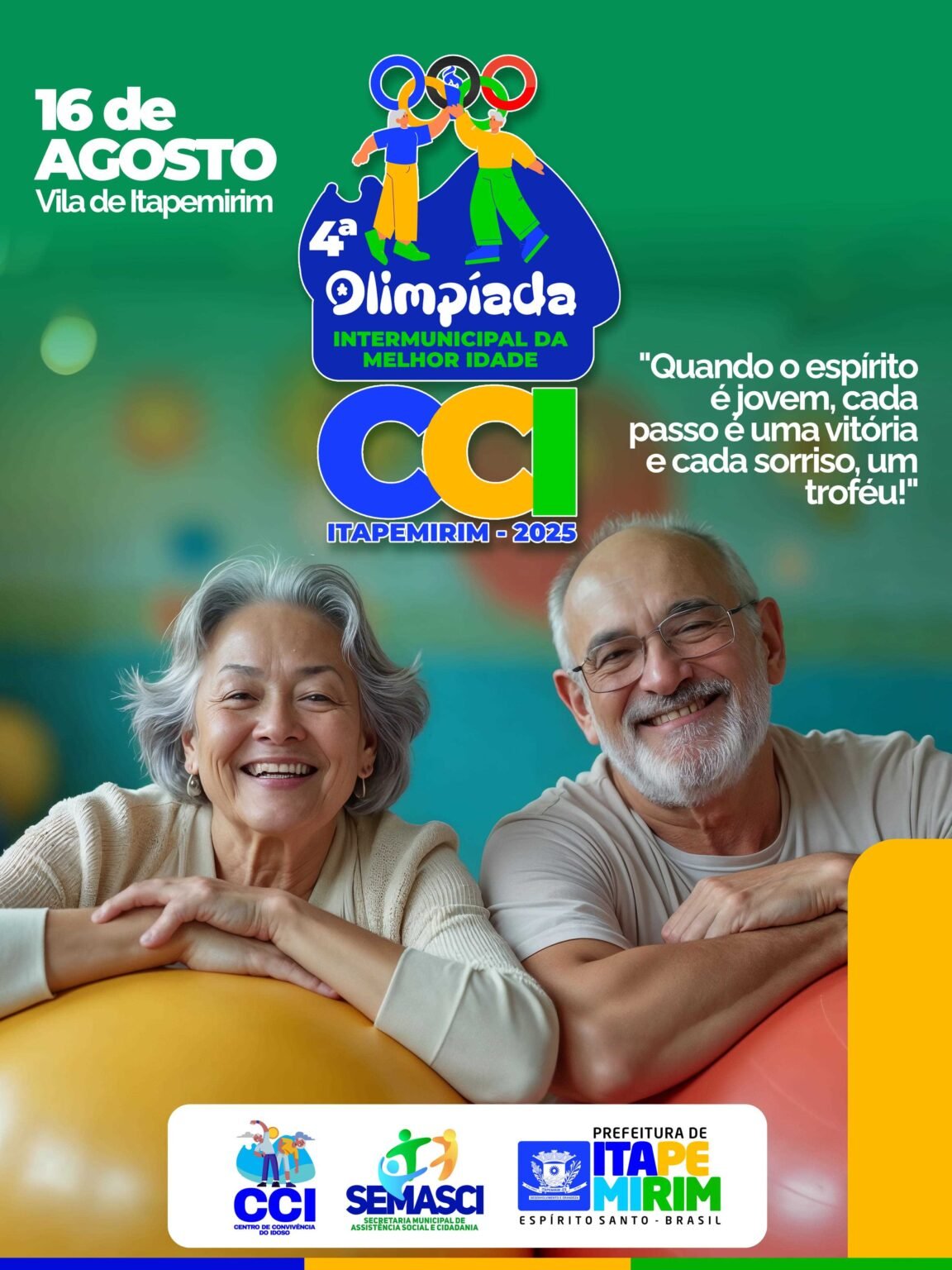 O município de Itapemirim está nos preparativos para a realização da 4ª Olimpíada Intermunicipal da Melhor Idade, prevista para acontecer no dia 16 de agosto (sábado). Promovida pelo Centro de Convivência do Idoso (CCI), com apoio da SEMASCI (Secretaria Municipal de Assistência Social e Cidadania) e da Prefeitura de Itapemirim, a iniciativa promete um dia de muita energia, saúde, integração e alegria.