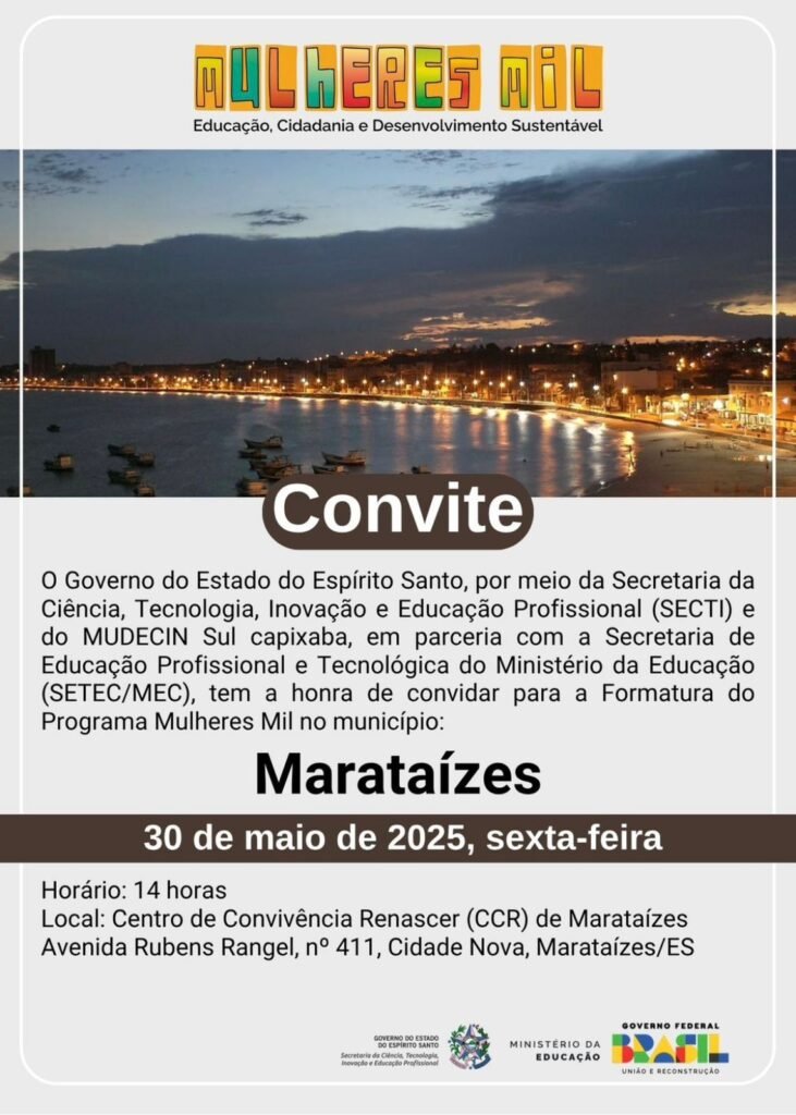 O Governo do Estado do Espírito Santo, por meio da Secretaria da Ciência, Tecnologia, Inovação e Educação Profissional (SECTI), o Coletivo MUDECIN Sul Capixaba – Mulheres em Defesa da Cidadania e da Inclusão, em parceria com a Prefeitura Municipal de Marataízes e a Secretaria de Educação Profissional e Tecnológica do Ministério da Educação (SETEC/MEC), têm a honra de convidar Vossa Senhoria para um evento marcante na luta pela emancipação e qualificação das mulheres capixabas.