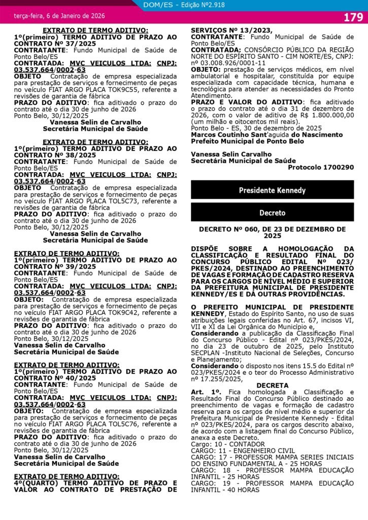 O prefeito de Presidente Kennedy, Dorlei Fontão, homologou oficialmente, na última terça-feira (6), o Concurso Público nº 023/2024, destinado ao provimento de cargos do quadro geral de servidores municipais. A medida marca o encerramento da etapa administrativa do certame e autoriza o início das próximas fases, como convocação, entrega de documentos, exames admissionais, posse e assunção dos cargos.