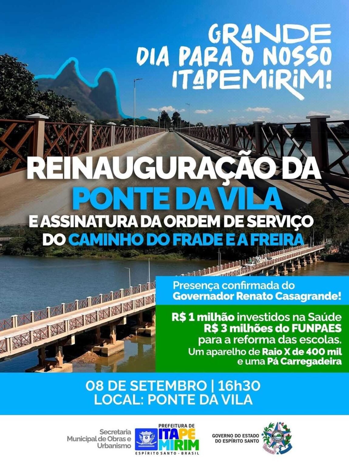 Na próxima segunda (8), Itapemirim se prepara para reinaugurar a famosa Ponte da Vila, uma das principais ligações do município. Na ocasião, também será realizada a assinatura da ordem de serviço do Caminho do Frade e a Freira, reforçando os investimentos em infraestrutura e mobilidade.